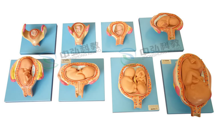 該模型由妊娠胚胎發(fā)育過程一、二、三、四、五、六、七個月胚胎和五個月雙胞胎等8個模型組成,其中四、五、六、七個月胚胎和五個月雙胞胎模型胎兒可以取出,并顯示子宮、陰道、胎兒、臍帶、胎盤、羊膜腔以及卵巢、輸卵管等結(jié)構(gòu)。