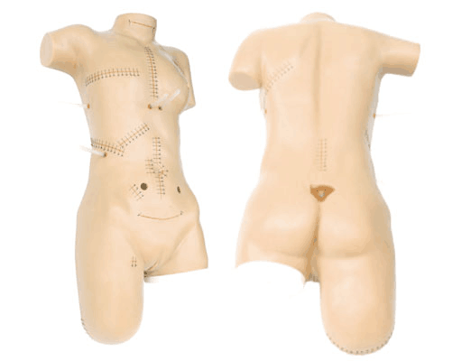 提供14個標準手術(shù)切口,可以用于練習和提高各種傷口的護理、清洗、換藥、包扎等基本技術(shù)。切口包括: