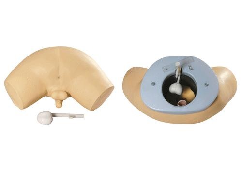 首先將前列腺檢查模型直立,把前列腺部件沿指示口向下插入前列腺檢查模型內,然后將前列腺檢查模型俯臥,可通過直腸肛指檢查觸摸前列腺形態(tài)、大小、硬度和腫塊等,每個模型部件可更換并插入前列腺檢查模型內。
