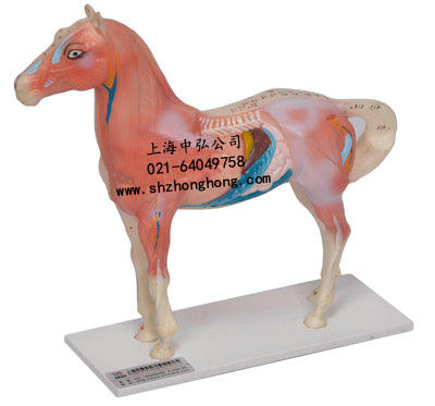 本模型顯示馬體左半部114個常用穴位,穴位用數(shù)字標(biāo)注。右半部顯示解剖面。用PVC制成,供獸醫(yī)作參考用。