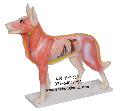 本模型顯示狗體左半部72個常用穴位,穴位用數字標注。右半部顯示解剖面。用PVC制成,供獸醫(yī)作參考用。