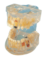 該模型由上頜牙列和下頜牙列兩個部件組成,并顯示乳牙上頜、下頜牙的發(fā)育形態(tài)和構(gòu)造以及齲齒、根尖膿腫等病理結(jié)構(gòu),共有14個部位指示標(biāo)志。