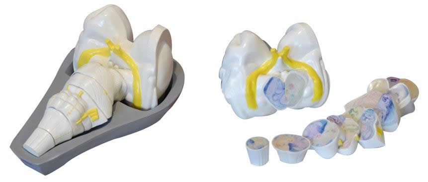 ZH/D117腦干橫切面模型可拆分為9部件,模型按成人腦干標(biāo)本成比例放大,平臥在底托板上。按水平線作有八個橫切,示:平錐體交叉切面,平丘系交叉切面,平舌下神經(jīng)斷面,平位聽神經(jīng)斷面,平展神經(jīng)斷面,平三叉神經(jīng)斷面,平下丘斷面,平上丘腦面,模型斷面上分別參照HE染色色澤涂色,一側(cè)示切片自然色,一側(cè)示神經(jīng)核、纖維的位置及毗鄰關(guān)系等;