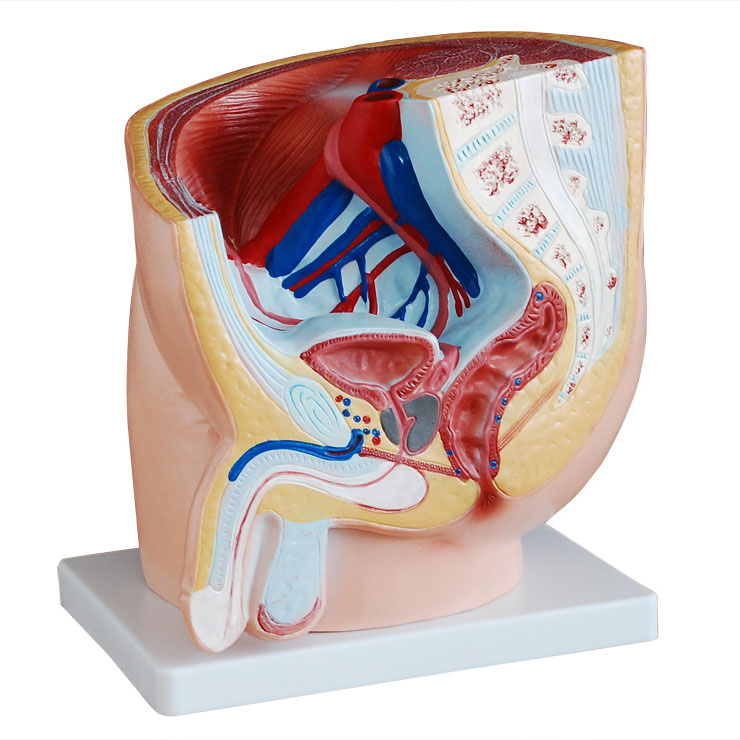 本模型作矢狀切面,顯示男性生殖器官和膀胱、直腸在骨盆中的正常位置。用PVC制成,安放于塑料座上。