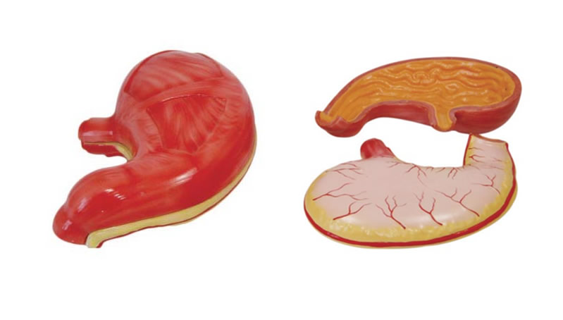 本模型作縱剖,顯示胃在中等度膨脹時(shí)的形狀,顯示:粘膜壁、幽門瓣、幽門括約肌、胃粘膜以及由食管向胃移行之粘膜等構(gòu)造。用PVC制成,根據(jù)實(shí)物放大2倍。