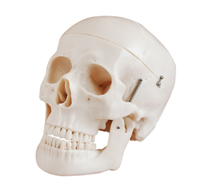 這款自然大成人頭骨模型顯示:活動下巴、切開的頭蓋骨和骨縫線,頭骨的表現(xiàn)極其逼真。分成三部分。用PVC制成。