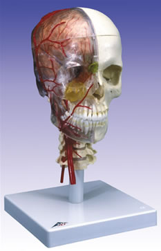 此款全球獨(dú)一無(wú)二的高質(zhì)量顱模型能回答研究解剖中的所有問(wèn)題。它的特殊教學(xué)用價(jià)值在于它能夠?qū)⑼该靼脒叺目梢暯Y(jié)構(gòu)轉(zhuǎn)移至骨結(jié)構(gòu)的半邊。 右邊透明半顱使得鼻竇可從外面容易地定位,因?yàn)樗鼈冇貌煌伾砻鳎荷项M竇(黃色)、篩狀竇(橘黃色)、前竇(綠色)、楔狀竇(紫色)。顱竇和頸及臉部動(dòng)脈也用色彩顯示:硬腦膜竇(藍(lán)色)、頸總動(dòng)脈、外部及內(nèi)部頸動(dòng)脈和腦膜動(dòng)脈分支(紅色)。 可從顱蓋外看見(jiàn)一半大腦,及其腦位置和竇道。通過(guò)透明頜研究牙周腔和牙根。下頜靈活裝置可顯示咀嚼肌運(yùn)動(dòng)。 頭顱置于頸椎之上,可拆卸為兩半頭蓋、左半顱底、鼻中隔、完整下頜骨和半腦。