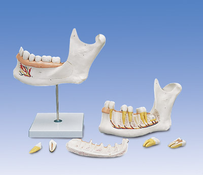 這款模型表現(xiàn)的是一個(gè)年輕人的左下頜。一部分骨可拆卸以展示牙根、海綿質(zhì)、血管和神經(jīng)。犬齒和第一臼齒縱切開(kāi),可拆卸以便進(jìn)一步研究。置于基架上。