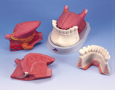 此模型展示了下頜到第二臼齒,帶有中切的舌部。右半部是舌下腺和下頜下腺,可進一步仔細觀察。置于可拆卸基座上。