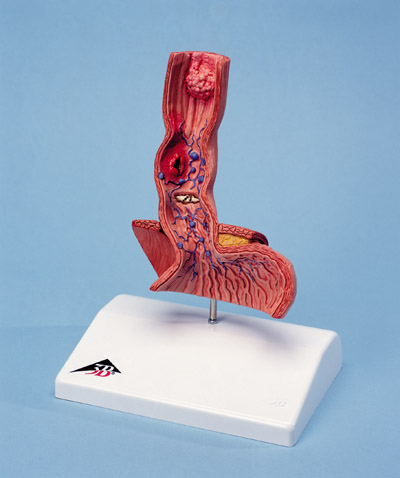 這款為病人解釋病理之用模型以實物大小展示了從食管下部直到胃上部的正切面。表現(xiàn)的是如下食管疾。