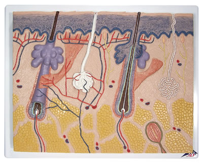 這款立體模型表現(xiàn)的是有毛發(fā)覆蓋皮膚3個層次的切面。在基板上展示了: