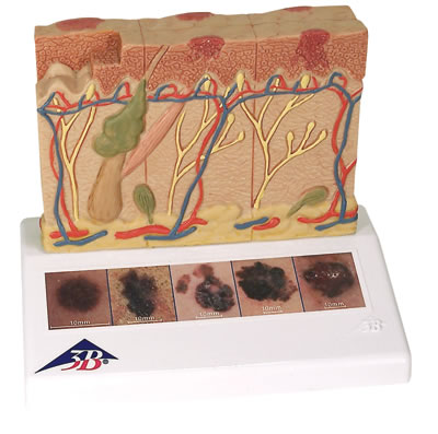這款3B Scientific®病變模型放大8倍展示了6個不同階段的黑色皮膚腫瘤的前面和側(cè)面:•健康的皮膚•黑色細胞位于表皮的表面•黑色細胞充滿表皮,稍微入侵乳突層•黑色細胞充滿乳突層•黑色細胞入侵網(wǎng)狀組織層•黑色細胞已達到皮下脂肪纖維,其隨體細胞位于靜脈附近