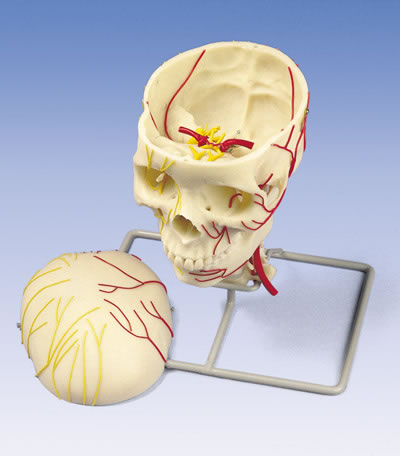實物大小的成人頭顱帶有7根頸椎骨。動脈突現(xiàn)一側(cè),神經(jīng)在另一側(cè)。頭蓋骨可拆卸,顯示顱底的主要神經(jīng)和大動脈。12根大腦神經(jīng)及其神經(jīng)也清晰顯露。
