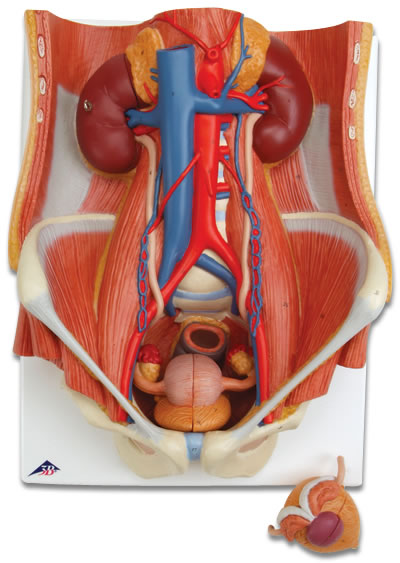 腎前半可拆卸。帶有容易替換的男性器官插件(膀胱和前列腺,切面) 和女性器官(膀胱、子宮和卵巢,中切)。編號。置于基架上。