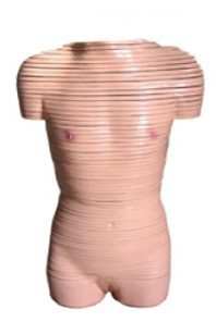 女性軀干橫斷斷層解剖模型顯示女性水平斷面解剖結(jié)構(gòu)和形態(tài),將人體從頸部到盆部整個(gè)軀干分解成63片典型部分的結(jié)構(gòu),由頸根部至坐骨結(jié)節(jié)作厚約1cm橫切片。