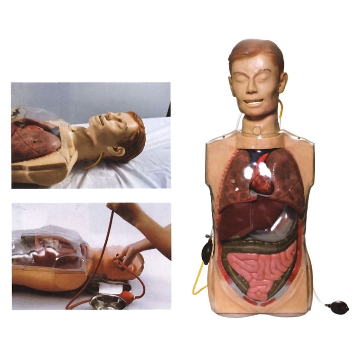 該產(chǎn)品模擬成人男性上半身結(jié)構(gòu),解剖結(jié)構(gòu)包括鼻腔、口腔、牙、舌、懸雍垂、會厭、聲帶、氣管、支氣管、雙肺、食管、胃、肝臟、小腸,采用進(jìn)口材料制成,手感真實(shí),胃部采用高強(qiáng)度透明材料制成,方便觀察。