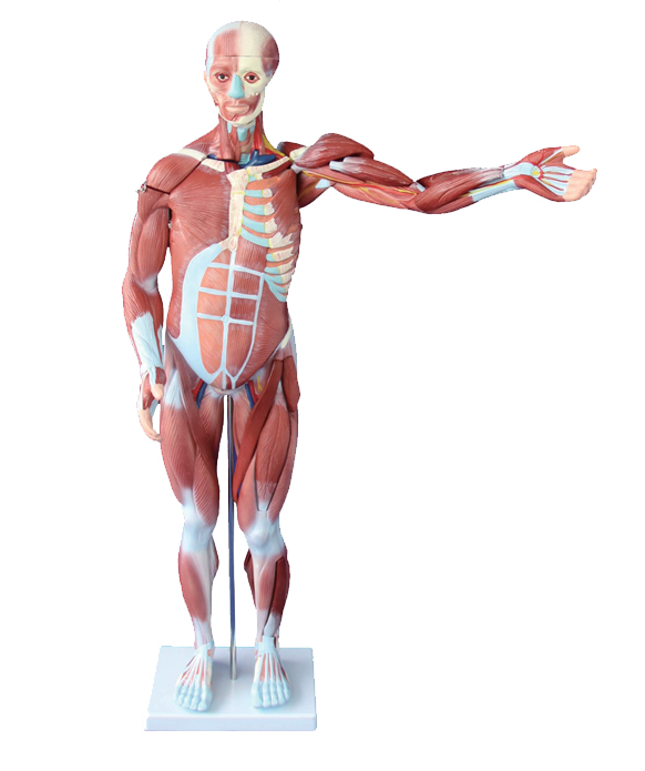 ZH-335人體全身肌肉附內(nèi)臟模型由全身肌肉、胸腹壁肌、上、下肢肌、顱頂骨、腦以及胸腹腔內(nèi)臟器官等27個(gè)部件組成,并顯示頭頸部、軀干部、上、下肢骨、肌肉、肌腱、韌帶、胸腹腔內(nèi)臟器官、血管和腦等結(jié)構(gòu),可分解為:軀干1件、頭顱蓋1件、腦2件、胸腔2件、右臂1件、左臂5件、腿9件、肺2件、心臟2件、肝臟1件、胃1件、腸1件。
