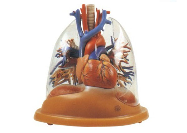 心臟與透明肺、氣管、支氣管樹模型由心臟、大血管(主動(dòng)脈、上腔靜脈)、氣管支氣管樹和膈等4部件組成,顯示心臟和大血管、透明肺、氣管、支氣管樹以及肺段支氣管相互毗鄰關(guān)系,從透明肺殼由外向內(nèi)可以觀察支氣管樹的分布情況。